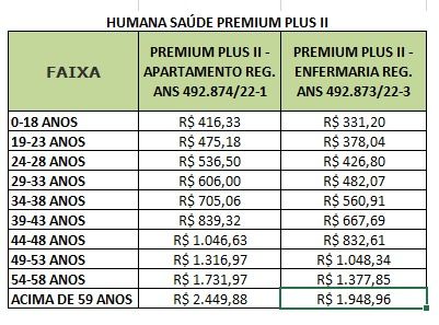 O plano PREMIUM II PLUS é uma modalidade oferecida pela Humana Saúde, também com ampla rede credenciada, que inclui Hospital Maranhense, UPC, Procárdio, Humana Clinic, Maternidade Natus Lumine (atendimento de urgência e emergência obstétrica), Dom Saúde e muito mais. O plano apresenta diferenças de valores para acomodação em quarto privativo e coletivo.